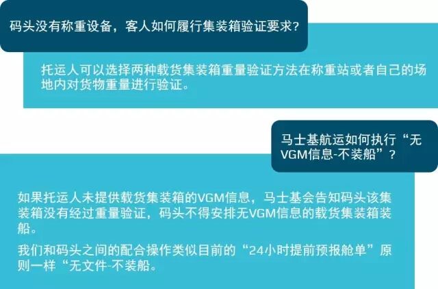 由于新规定的实施,码头有责任确保在最终确定装船计划之前拥有每个订舱的完整VGM信息。马士基航运也将保证最终的装载计划只包含这部分订舱。