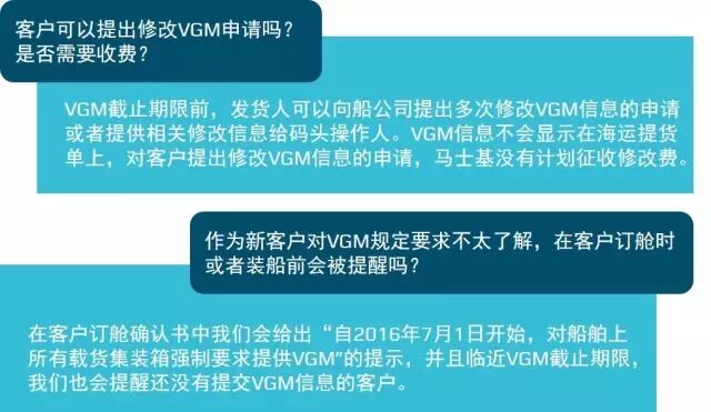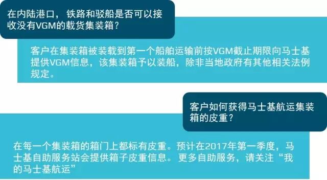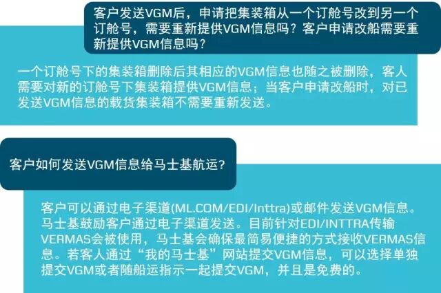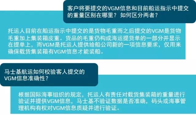 发布时间:2016-06-23相信大家对集装箱重量查核(Verified Gross Mass,简称VGM)都不再陌生,继2月份马士基发布了关于VGM的消息后,为了确保客户的VGM信息提交顺畅和简化码头数据交换流程,这段时间马士基航运正配合政府相关部门评估新约对客户和市场可能带来的影响和变化。在此期间,我们也陆续收到大家的咨询,这里小编整理了一些相关小知识和常见问题,希望对大家进一步了解这一新规定有所帮助。